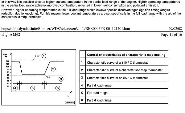 不過開始用車之後我有個習慣就是會利用OBC去看他的引擎水溫, 不看還好, 一看之後發現BMW原廠的設計還真的是多數時間引擎維持在高溫的狀況(108度左右), 所以我花了一些時間找了原廠的資料來看, E38前期的車款都還是使用傳統機械式的節溫器, 因此引擎的溫度主要由節溫器的規格來決定, 後期車已經改用電子節溫器, 引擎的工作溫度就由引擎電腦內的程式邏輯來決定, 詳細的資料請參考下面這個資料, 這個是由M62引擎的原廠資料節錄下來的, 但我猜M73應該一樣: