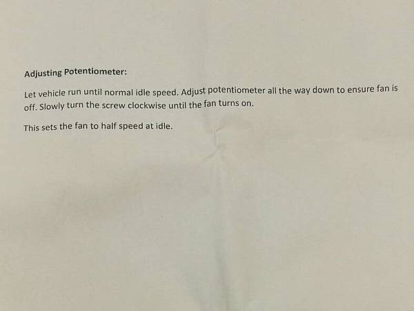 而風扇控制的部份, 原本這組他附的是兩段式的風扇控制, 一段高速, 一段低速, 低速這段是用電阻降壓, 只有噪音小一點, 耗用的電流還是一樣大, 而且他的啟動點是直接用溫度開關在控制的, 因為原廠的設計在車頭還有一個輔助風扇, 這個輔助風扇是用吹的與後面這個用吸的電子風扇要搭配, 要不然會造成大部份的散熱工作都由比較低溫就啟動的那個風扇全擔了, 這樣對水溫還有對風扇的壽命都不好, 因此我希望啟動的溫度要由我們看系統的狀況來設定, 而且風扇要可以做轉速的無段變速, 因此決定把風扇控制器換掉, 後來選用的控制器如下, 這個是PWM的控制器, 啟動溫度可以藉由上方的藍色VR來做調整, 啟動後轉速是50%, 溫度高過啟動點6.6度C (20度F)以上全轉, 中間隨溫度無段變速, 取用的電流也是看轉速大小, 最小10A, 最大22A, 低於啟動點20度C以下停止, 車輛熄火之後會繼續運轉一分鐘幫助散熱, 這樣引擎室內的零件壽命應該會好很多, 還附溫度感應器, 另外把說明書也讓大家看一下, 很簡單就三張紙.