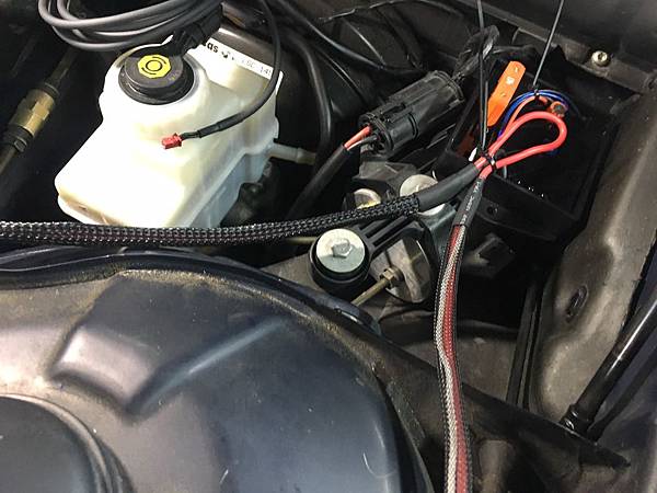 決定風扇控制器之後就是配線了, 基本上照說明書的圖配線, 為了延長使用壽命應該要把這個遠離熱源, 所以放在煞車總泵那個區域, 如下, 使用耐高溫的線材, 配線再用網管包覆