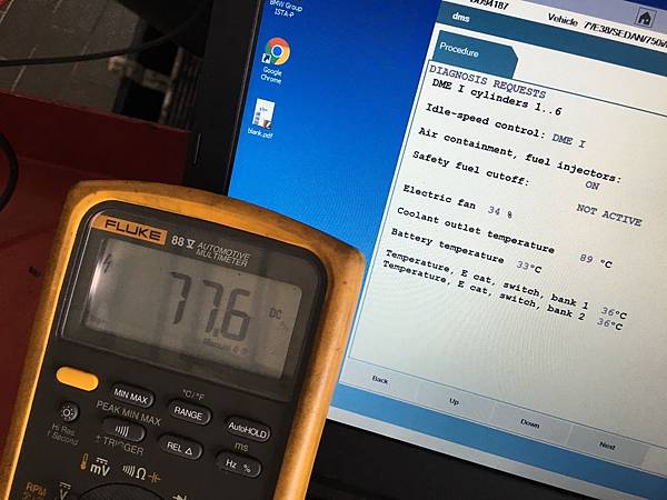 加完之後開始調整, 用電腦可以看水溫(Coolant Outlet Temperature)及前面輔助風扇(Electric Fan)的速度, 三用表是看電子風扇的轉速(Duty Cycle %)