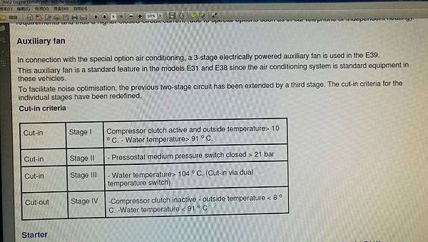 電子風扇的起動點要調整好, 因為要讓我們安裝的電子風扇與原本的輔助風扇共同分攤散熱的工作, 因為輔助風扇是由DME直接控制, 我們沒有辦法更動, 如果電子風扇的啟動點沒調整好會影響散熱效率及風扇的壽命, 下面的圖是M62的輔助風扇的控制邏輯: