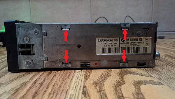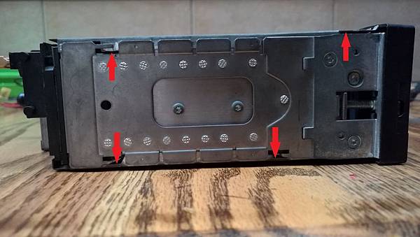 再來要把前面板內的金屬板也拆下來, 因為我們的模組寬度比原來的洞要大, 所以金屬板也要拆下來加工, 這片金屬板與左右兩邊的卡榫的機構是鎖在一起的, 所以要先把左右卡榫的機構件也拆下來, 如下圖, 每一邊各有三顆行星型的螺絲: