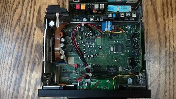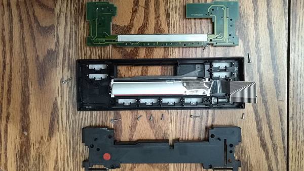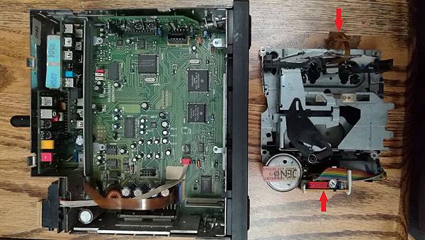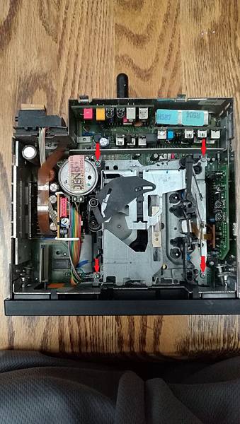 撬開之後就可以看到卡帶的機構, 有四個螺絲固定, 我有標示出來, 用星型螺絲起子拆掉, 再把左右兩片電路板向上拔開就可以把整個卡帶的機構取出來