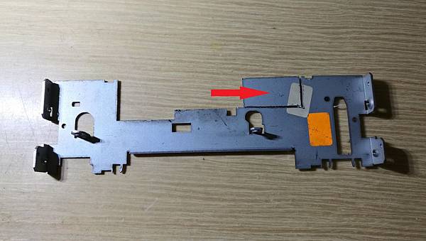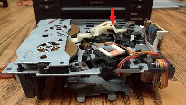 拆開之後檢查一下這個卡帶的機構果然有問題, 有個零件已經翹起來了, 所以怪不得動作不正常, 所以把它廢掉也是應該, 如下圖: