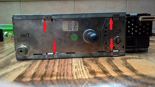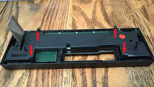 目前的想法是把卡帶的機構拆掉, 然後把這個模組安裝在卡帶的那個位置, 有稍微合一下尺寸應該是可以放得下去的, 接下來就拆主機了, 主機的上下蓋都只是卡住而已, 因此用平頭的小起子就可以撬開, 位置在照片中有標示出來, 如下面三張照片: