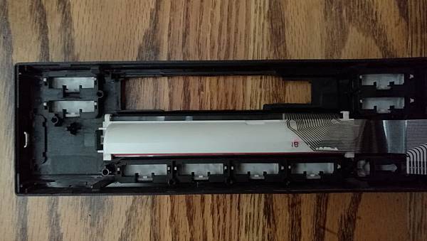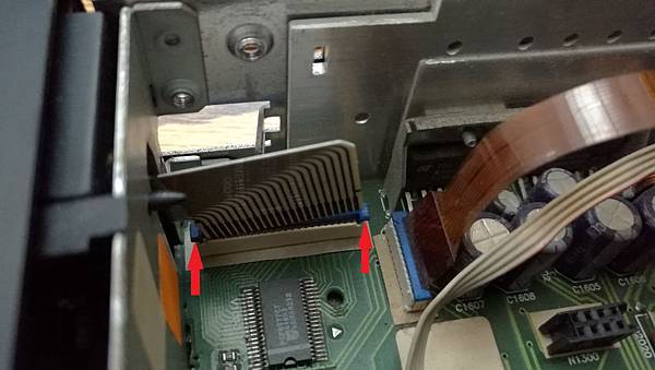 因為我們的模組要裝在前面所以要先把前蓋拆掉, 前蓋有個排線要先拔掉, 拔的方式, 將連接器左右兩端藍色的機構件要向上提起, 不用太大力, 鬆開之後就可以把排線向上拉出來, 如下圖: