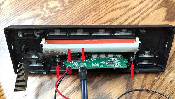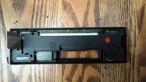 這個音響的前面板有包括按鍵及一個小的液晶螢幕還有個塑膠背蓋, 因為我們要加工最外面的面板所以要拆開才方便工作, 如下圖: