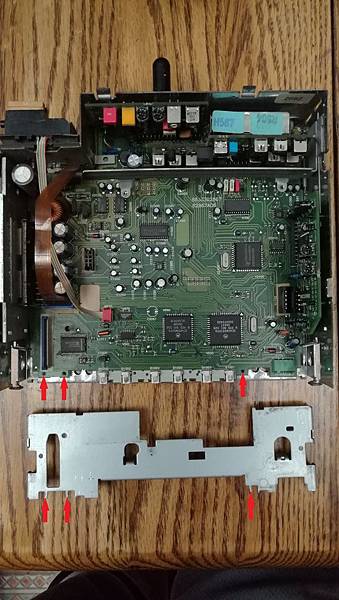 接下來就可以拆前面的鐵板了, 這個鐵板在下方有三個突出的小牙齒夾在PCB上面所以拆的時候要用一字起子去扳一下讓那個牙齒與PCB脫開之後鐵板就可以向上方拔出來, 拆開之後如下圖, 照片中有標示的就是那三個小齒及固定孔: