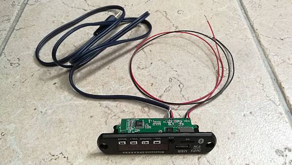 模組要組裝上去之前先用有AUX IN的音響先試一下功能是否正常, 把電源線及音源線都接上, 音源線要用隔離線比較不容易受干擾, 如下圖: