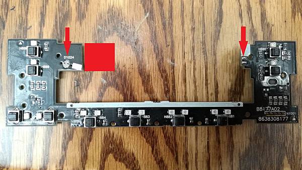 測完之後一切OK, 所以可以進行下一步, 剛才我們挖了鐵板及塑膠面板, 但是內部的PCBA也有部分擋到需要切掉, 還有兩個LED有干涉, 所以把這兩個零件拆掉, 這兩個LED只是照明用途, 拆掉不影響其他的功能, 如下圖, 紅色方塊是PCB要切掉的區域, 那兩個箭頭就是LED要拆掉的位置, 照片中的零件是已經被拆除了: