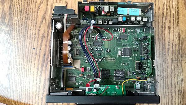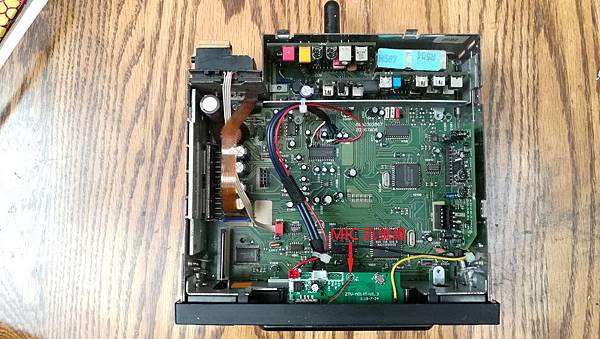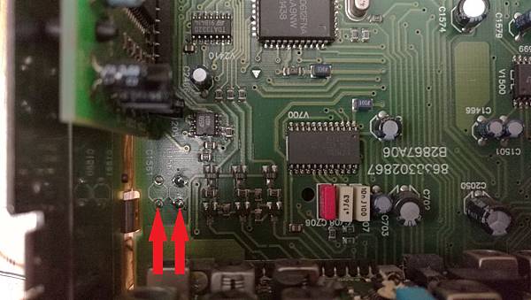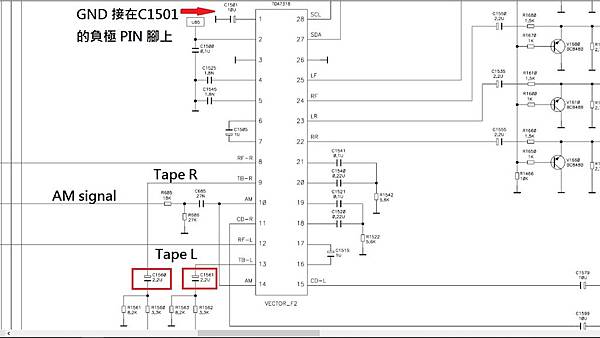 由上面的圖可以看出來Tape 的訊號是經過電容C1560 & C1561 之後才送到TDA7318 的PIN 9 & PIN 13, 之前許多車有的改裝都是要把IC 的腳翹起來, 再把訊號線接上, 但是我覺得翹腳這個動作失敗的機率太高, 所以我的做法是把C1560 & C1561 這兩個電容拔掉, 之後訊號就可以直接焊在PIN 9 & PIN 13 上面這樣比較不容易失敗, 下面就是這兩個電容的位置, 我已經把它拔掉了, 在靠近機器後面右邊的位置: