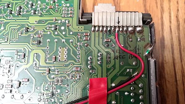 目前的做法只有再回去接原來AM輸入的那兩條(PIN 10, 14), 只是這樣AM功能就會被廢掉, 不過測試的過程有個問題, 因為我們電源是接+12V Acc, 所以表示+12V Acc 一送電這個模組就會開機, 但這時候音響主機不見得有打開, 有點不同調, 所以修改訊號線的時候順便把電源改接在TDA 7318 的PIN2 VCC 腳上, 接在這一點應該會與Radio 的Power on 同步才對, 訊號改接PIN 10(右聲道), PIN 14(左聲道), 這邊我的接法是PIN 14 翹起來直接連接, 因為在IC的最後一腳比較好翹, PIN 10 原本的線路有連接到其他的地方, 我們把他的PIN 腳連出來的銅箔電路切斷, 這樣就不用翹腳可以直接焊在PIN 腳上, 這樣比較不容易失敗, 請看下圖連續三張: