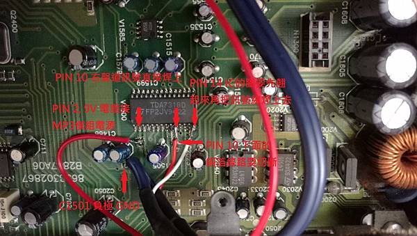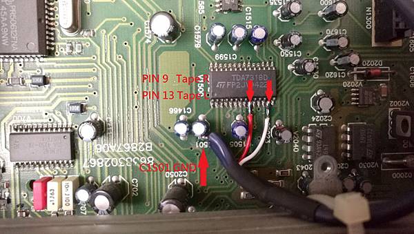再來就是左右聲道的訊號還有地線, 地線就接在C1501的負極PIN 腳上, 左右聲道因為我們電容已經拔掉, 所以可以直接焊到PIN 9 (右聲道) & PIN 13(左聲道), 請看下面的照片: