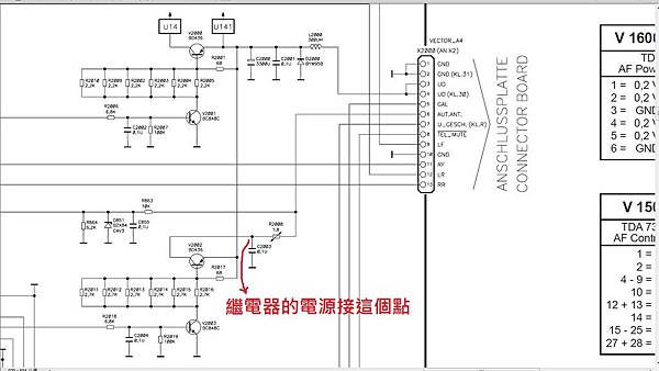 確定這條線的訊號可以用之後就要看如何在機器內部找到接線的位置, 預計增加一個繼電器來控制模組的電源, 請看下面的線路,我有把我們要接到繼電器電源的個 點標示出來, 這個點的電源是由V2002 BD436 這個電晶體來提供的, 我有量過我們用的繼電器耗電是35mA, 而這個晶體的規格可以上到4A, 所以推繼電器沒有問題: