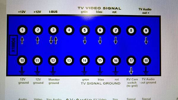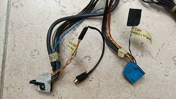 前一陣子試組了E38 原廠的大螢幕主機, 因為原來的系統要換掉工程還蠻大的, 因此要一次把所有的系統規劃好再上車, 這樣會比較有效率一些, 因為原廠的TV 模組系統與台灣的不合, 所以這個介面最有價值的是他的AV Input 的功能, 但是很不幸他AV Input 只有支援單音, 所以實用性也沒有很高, 再加上我最想用的是導航的畫面, 而實際上在導航的過程中, 我們會希望可以聽收音機或是其他的音源, 因此將畫面與聲音的輸入選擇分開是比較合理的做法, 因此目前的想法是要利用TV 模組的倒車輸入來做這個事, 因此要先試一下到底這個倒車的Video Input 是否有效, 因為這個訊號在WDS 完全沒提, 不知是真是假, 在網路上搜尋了一下找到這一份資料, 有TV 模組藍色及白色接頭的說明, 如下圖: