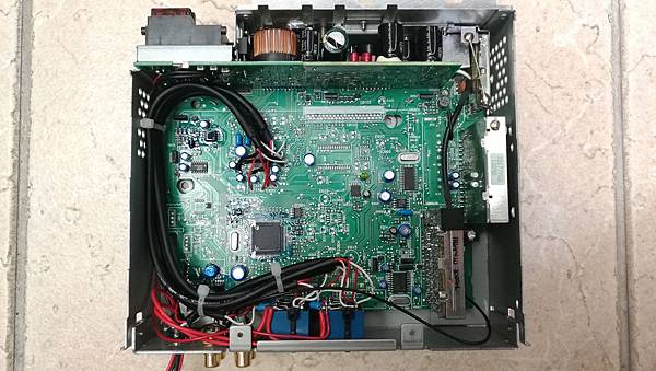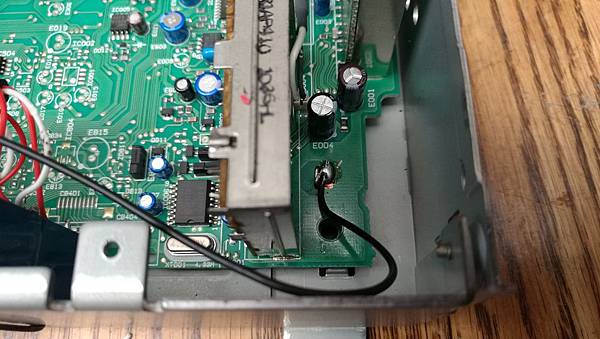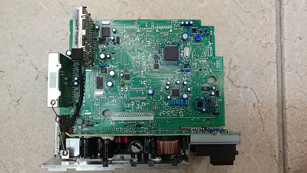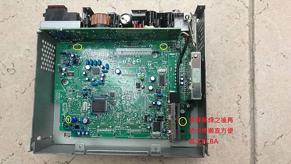 拆開之後就可以看到電路板了, 不過因為我們要拆板子上的零件還要追線路, 所以要把PCBA 拆出來, 電路板是由四個鐵片的卡榫卡住的, 右下角的有用錫焊住, 所以要先解焊, 之後再把鐵片卡榫搬直就可以把電路板取出來了, 如下圖: