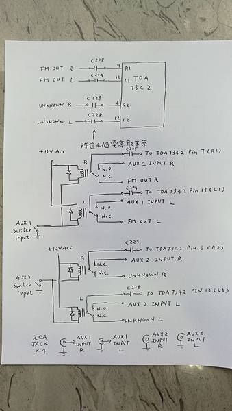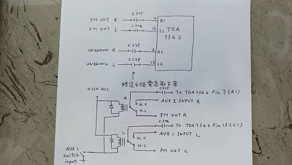 修改的想法很簡單, 把TDA7342輸入端的電容拆下來, 再用這個電容的兩端把訊號送到繼電器透過外接的開關來切換, 看是選擇我們外面另外送的訊號還是走原廠設計的訊號, 至於為什麼要做兩組輸入, 其實我只須要一組, 原因是我不知道那一組是對應到什麼訊號, 所以乾脆兩個都改好, 之後再來決定要用那一組, 所以線路圖現在標示的FM Output 這也是我試完後才知道的, 剛開始在設計的時候也只是把他當成另外一個Unknown Input, 線路圖如下: