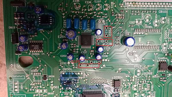 再來就是要把C204/C205, C228/C229 這四個電容拆下來, 拆的時候要小心, 不要把零件弄壞, 因為之後還要重複使用這四個零件, 這四個電容是184 (0.18uF)的數值, 如果要低頻好一些也可以換大一點的電容, 拆這個要有點技巧, 小心慢慢拆就是了: