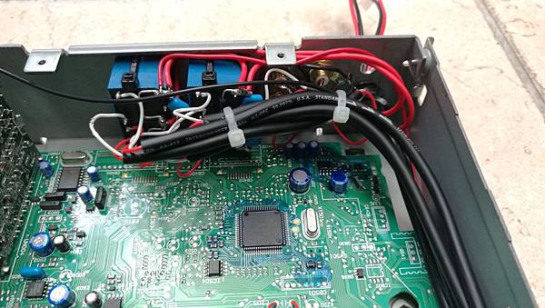 藍色的方塊是繼電器,用束線帶固定在鐵板上, RCA 頭是鍍金的: