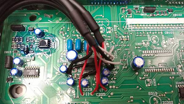 黑色是地線, 紅色是R 白色是L, 線太多IC 都快看不到了.