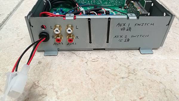全部接好的外觀圖, 左邊的兩個連接器是用來控制切換AUX Input的開關: