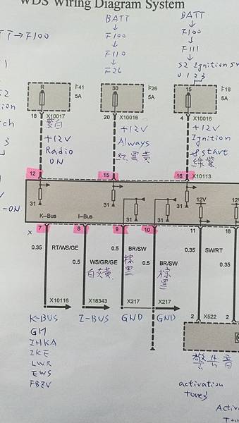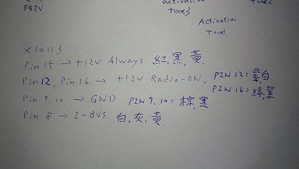 接線的方式也很簡單, 我就不劃線路, 請直接看下面的圖片, 上面有標示, 箭頭後面的訊號線名稱與我在上一篇” 如何在車外複製I-Bus 環境” 這篇內的電路圖上的線路名稱是一樣的, 後面是電線顏色的標示: