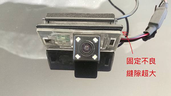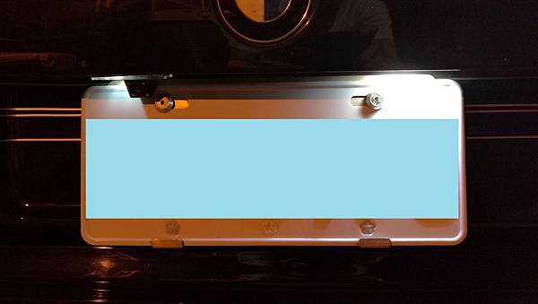 有照到一部份的保險桿, 這樣要比對與障礙物之間的距離會比較準一點, 另外一個問題就是因為當時改了倒車鏡頭, 所以左邊換成了LED燈, 但右邊還是一般的燈泡, 所以晚上點燈之後, 左右的牌照燈色溫差太多, 還有因為倒車鏡頭是凸出來又靠近車牌的內側, 因此那個LED燈的光線會被遮掉一半, 所以晚上開燈之後的牌照會蠻好笑的, 照片如下, 完全沒有高級車的質感, 所以就來動手改一下.