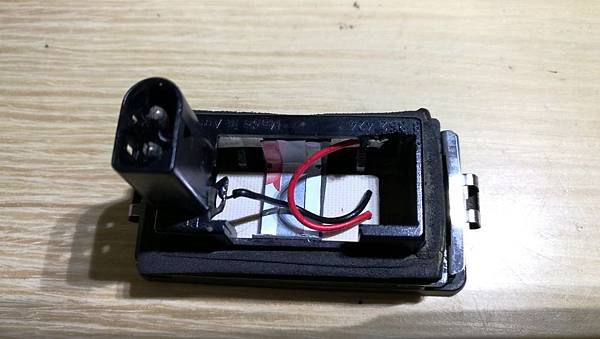 選這個是因為這樣要修改原廠的牌照燈會比較方便, 同時完成度也會高一些, 但是風險是照射的角度沒有辦法調整, 這個一定要上車才能夠確定, 所以還是先改再說, 在原廠的牌照燈上鑽一個大一點的洞就可以了, 如下: