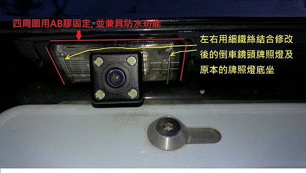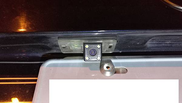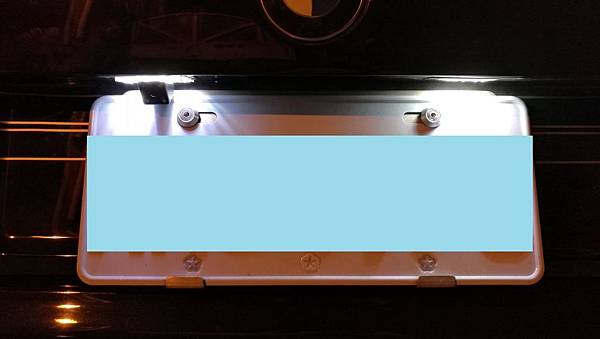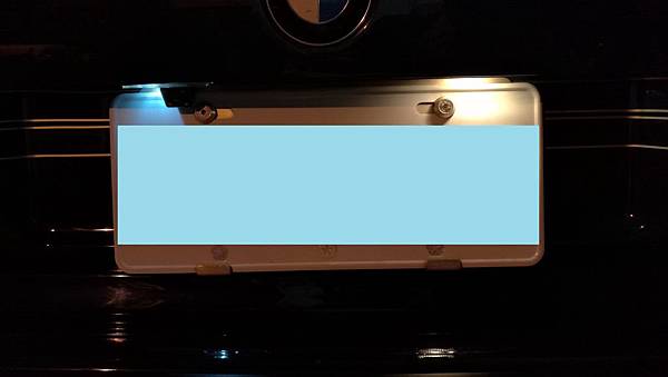 雖然還不夠完美但應該算80分吧, 先撐一下再說了, 總比原本的狀況好, 修改LED牌照燈的部份沒拍到, 其實也就是在鏡頭兩邊各放一組LED 燈, 這樣就不會被鏡頭檔到了, 實際上車及開燈的狀況可以看一下這張照片, 由照片可以看到鏡頭的兩邊都有光線透出來: