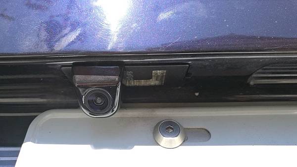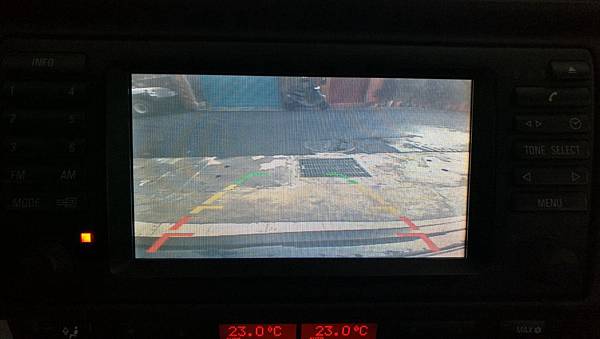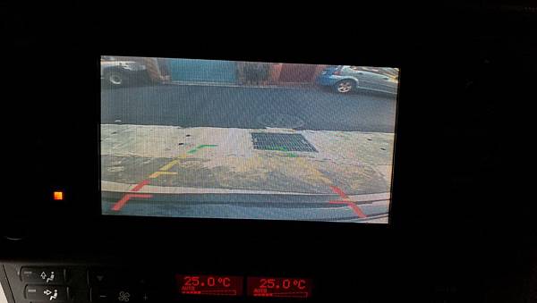 可以看到, 前手音響店是外加了另一片倒車鏡頭及牌照燈的組件在原廠的牌照燈上, 但是固定的不太好, 縫隙大了一點, 對於我這種龜毛的車主而言當然是有改善的空間, 不過醜歸醜, 功能是還不錯, 至少照射的角度及廣度是可以接受的, 倒車畫面如下: