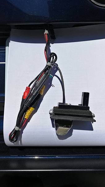 裝上車之後就是這個角度, 鏡頭在外側, LED 燈應該不會擋到太多才對, 接下來就是上車了, 一樣把原本車上的牌照燈挖出來, 線組也一起拉出來, 因為車後箱蓋內部的空間不大(被兩片板金夾住), 只有一個狹長的空間, 所以線組拉出來要小心, 同時要裝回去的時候也要把線組包覆成一樣的形狀才會好塞進去, 拉出來的線組如下, 原本有泡棉包覆, 這是為了避免行車時震動造成異音, 不過要拍照所以已經移除了, 如下: