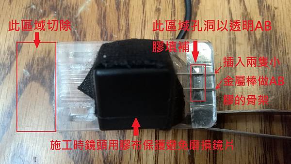 原本的兩大問題, 牌照燈光線左右不均, 還有鏡頭固定不良, 把舊的拆開之後發現原本音響店改裝時是用熱溶膠黏的, 大家應該知道夏天的太陽底下車輛的溫度可以高達70~80度, 所以也不奇怪為什麼縫隙會那麼大, 因為膠都已經溶化了, 先把鏡頭移到中央, 要移動原本的外加的部份有幾項工作要做, 原本鏡頭左邊的LED燈要拆掉因為內部會擋到結構, 左邊的塑膠要切除一部份, 沒切除會凸出底坐, 右邊的洞須要補起來, 要不然會漏水, 拆LED 簡單, 就美工刀加斜口鉗就可以了, 切除的部份用鋸子鋸掉, 要補的洞稍微麻煩一點, 先用小鑽子由側面鑽孔, 之後塞入兩小段鐵絲當AB膠的骨架, 再用透明AB膠補滿, 等乾掉之後就有結構性的強度了, 再把這個外加的組件與原廠的牌照燈底坐結合, 四周用AB膠固定, 同時也兼具防水功能, 為了能撐更久, 再多補兩條鐵絲穿過原廠的底坐來固定, 這樣應該萬無一失了, 照片如下: