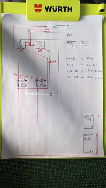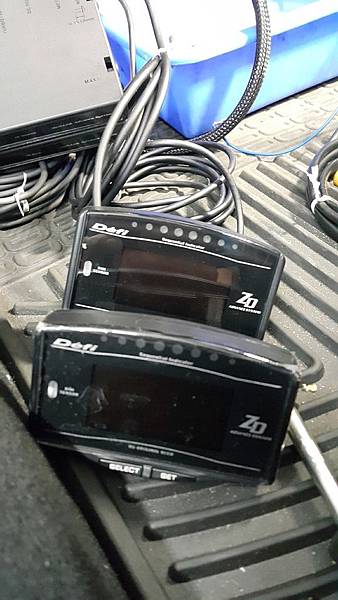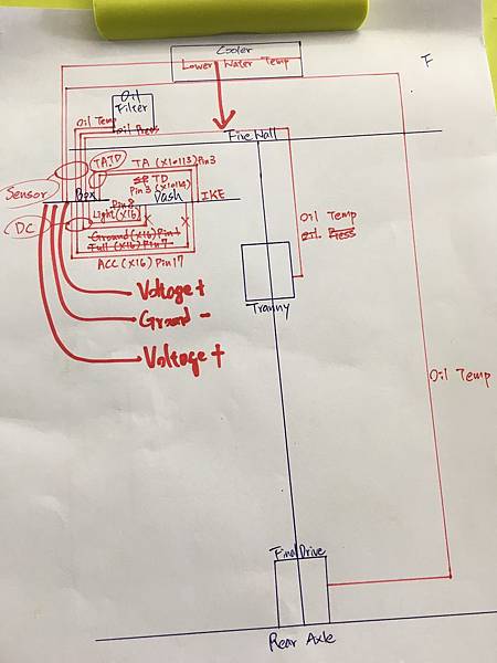 為了怕忘記量測項目所以貼了張貼紙在顯示器前方, 標示左右錶頭量測的項目, 左邊:水溫, 油溫, 油壓, 主電池, 右邊: 變速箱油溫, 差速器油溫, 輔助電池: