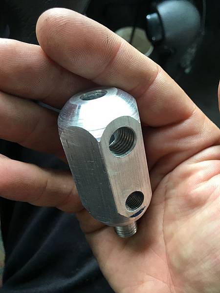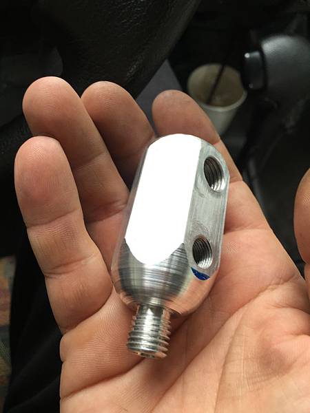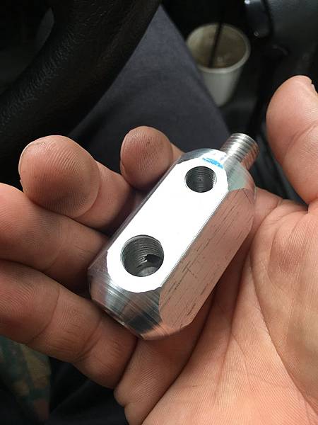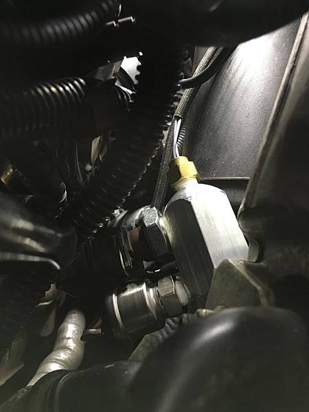 上面的照片只是要讓大家有個感覺, 單純為了一個不要切水管的要求, 我們須要投入多少的心力, 有時候這就是龜毛的代價, 不過套句某家車廠的廣告詞, “專注完美, 近乎苛求” 就是這樣的理念, 水溫的部份搞定了, 再來就是油溫及油壓的部份, 我們是接在機油濾芯的附近, 接法一樣是做一個轉接頭把外加的兩個感應器安裝在原本裝原廠感應器的位置, 因此這個轉接頭上面要有三個感應器的安裝孔, 這個說起來簡單, 但是實際執行的時候有個問題, 因為V12引擎室所剩的空間不大, 所以最後這個轉接頭鎖死的時候那個角度很重要, 因為如果角度不對, 外加的感應器就會因為空間不夠而無法裝上, 因此這個只有用實際安裝的狀況來修正, 也就是要安裝之後看差異再拆下來送金屬加工廠修正之後再上車, 所以大家看照片可能三秒鐘就閃過可以實際角度要調整好可能要來來回回好多天才能完工, 又是一個“專注完美, 近乎苛求” 的案例, 說真的要是車廠沒有這樣的理念, 而車主有這樣的要求, 老闆應該會翻臉吧! 還是一樣直接看照片吧: