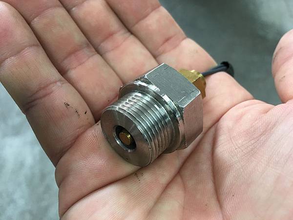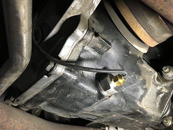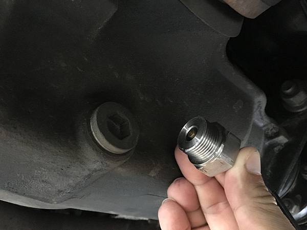 再來是變速箱油溫及差速器油溫, 這兩個我們直接用原本放油螺絲的位置來鎖感應器, 相對比較簡單一些, 就是做個有感應器的螺帽鎖在原本放油螺絲的位置就是了, 直接看照片吧: