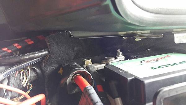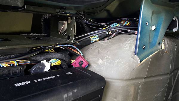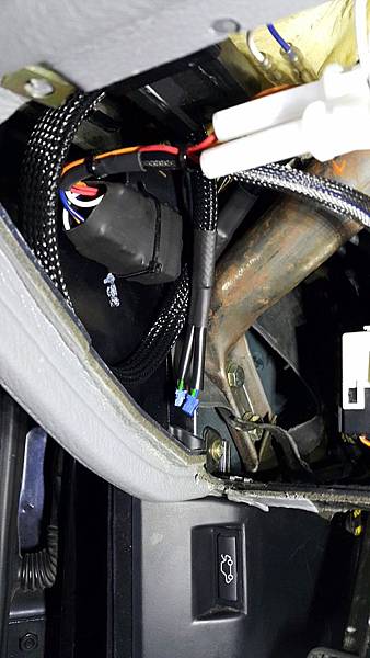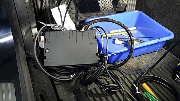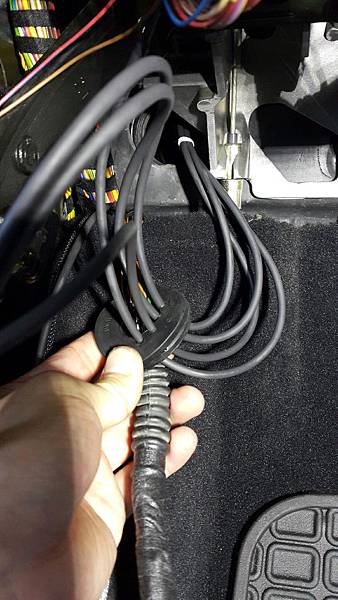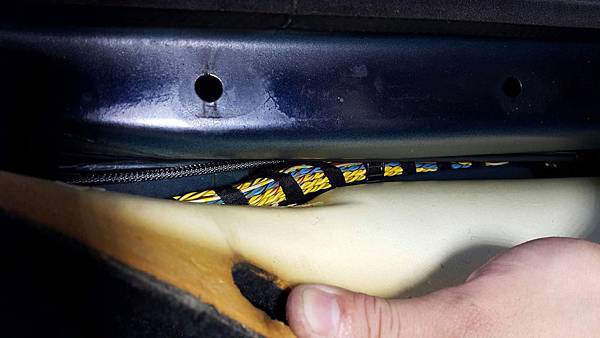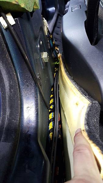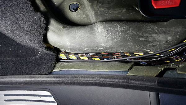 由左後方的座椅區域穿入車內, 與音響線路的走法差不多, 在車內要翻後坐倚及地毯也是個大工程: