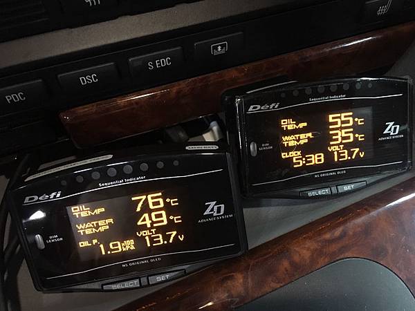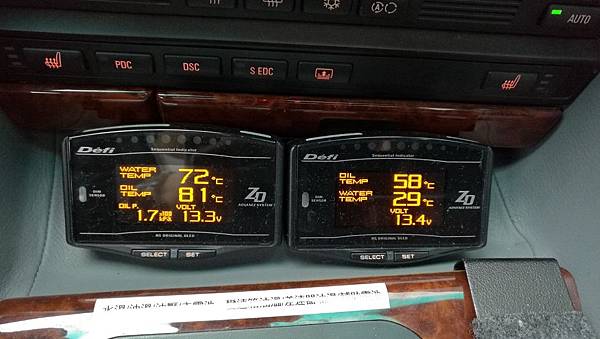 之前B12 有改了電子風扇及節溫器, 主要是為了解決引擎工作溫度過高的問題, 因為原廠的設計雖然會由引擎監理電腦自行控制, 但是我用解鎖之後OBC 的Test-07 的功能去看引擎的工作溫度, 以我日常行駛的狀況大多數時間都維持在108度上下, 如果夏天室外氣溫高再加上塞車還有機會更高, 雖然引擎工作一切正常, 但是看到這樣的溫度還是很擔心, 因為我認為引擎室的高溫會是影響車輛可靠度的一個重要因素, 所以才會想去修改電子風扇及節溫器, 不過改完之後為了要調整當初選用的PWM風扇控制器所以必須要比較精確的量測散熱排的出水口(也就是下水管)的溫度, 所以想說既然有這樣的須要就來安裝一個比較好的監控儀表吧, 因為B12 也算是高級車, 如果把車內裝一整排的錶頭這種競技風格的改法就失去E38 高級車的質感, 選來選去找了Defi 的ZD System, 這款儀表功能夠多, 而且螢幕顯示的顏色是很漂亮的橘黃色, 與BMW 車系慣用的正好非常接近, 所以就決定這款了, 另外說明一下這個專案是交由Boost Motosports 的專家光頭大師執行, 我只是整理加記錄加PO文而已, 那我們就正式開始吧, 請看照片如下: