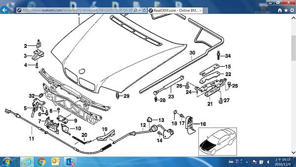 先看了Realoem 網站上有關引擎蓋部份的零件圖, 其實這一張有參考效果, 但是他的圖示與車輛上真正的狀況是有差異的, 這也是後來我把引擎蓋打開之後才看出來的, 不過這張還是有用的, 請看圖片: