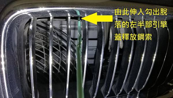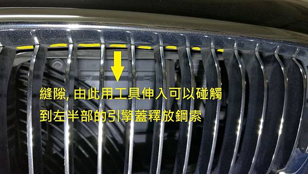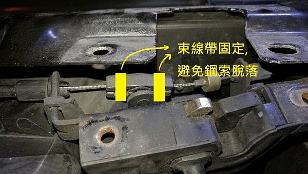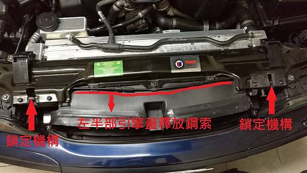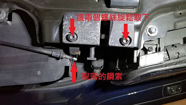 昨天 (2016-12-03 週六) 看到FB社團車友 蔡大要約週日上午車聚, 想說每次去大家都會開引擎蓋互相品頭論足一下, 所以週六就把我的車送去清洗一下, 同時要求引擎室內也稍微清潔一下, 中午把車開到熟識的汽車美容店我就先離開了, 不過沒多久就接到店長的電話, 說我的引擎蓋無法打開, 我想說怎麼會這樣, 因為我一個星期大概會開個兩三次看一下狀況, 之前都是正常的, 所以只有等車輛取回再來看狀況好了, 晚上把車取回之後, 試了一下, 糗了, 還真的開不起來, 由車室內部去轉動那個釋放拉柄的感覺就不太對勁, 有點虛虛的, 初步檢查了車室內部的拉柄, 有把中央的螺絲拆下來看, 那個鋼索是有連接在上面, 而且轉動的時候鋼索也有正常動作, 所以問題不在這邊, 車室內的拉柄轉動之後, 到車輛前面, 把鼻頭內部的拉桿拉一下同時向上提, 可以發現靠近駕駛座這一邊引擎蓋是有稍微浮上來的, 但是副駕駛座那一邊完全紋風不動, 這下尷尬了, 如果引擎室開不起來, 明天車聚不就掃興了嗎! 所以還是想辦法自己處理一下