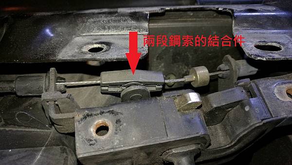 勾出來之後用尖嘴鉗把鋼索頭部拉一下就可以釋放副駕駛座那一側的鎖定機構, 抱歉這邊太趕沒拍到, 引擎蓋打開之後就容易了, 原來是後半段的鋼索與前半段的鋼索在駕駛座那一側的鎖定機構內有個結合件, 鋼索頭端的固定座要塞入凹槽當中, 不過目前的狀況是已經脫落, 所以拉車內的拉柄只有釋放單邊, 另一邊還卡住所以開不開, 要修復也簡單, 先把鎖定的機構件拆下來, 鬆開三個螺絲就可以, 如下面兩張照片: