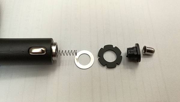 不過為了車室內的完整度目前的想法是要改裝一下, 放到原本中船點煙器插頭旁邊的煙灰缸內部, 平時不用點煙器的外蓋還是可以蓋起來, 這樣感覺比較對味一點, 因為我自己不抽煙, 也禁止其他乘客在車上抽煙, 所以煙灰缸對我來說是沒有用的, 所以把這個模組改裝的煙灰缸的位置其實還蠻適合的. 因為原本煙灰缸的部份深度不深所以這個模組要先分解一下才能放進去, 拆開的方式由頭部把正極固定板的螺牙逆時針轉開就可以, 如下: