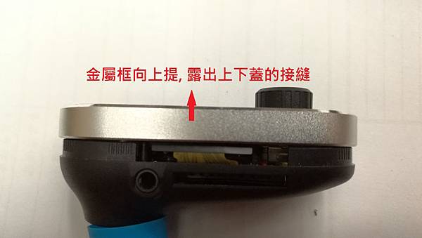 接下來因為要焊電源線以及把AUX In 的插座拆掉所以須要拆到上半部, 拆除的方式是把旁邊那一圈金屬框向上提, 讓上蓋及下蓋的接縫可以露出來, 請看下面兩張圖片