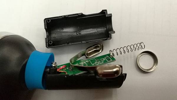 轉開之後正極就分開了, 再來把負極的部份也拆開, 用個尖頭的起子插入圓柱體兩邊的結合線, 內部卡榫被撥開之後就可以分解, 如下: