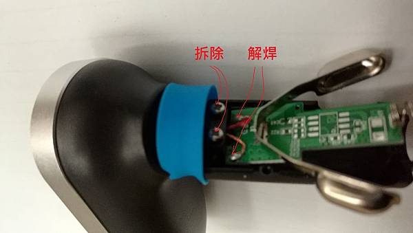 兩個小螺絲拆下來, 還有兩條電線解焊一下, 就可以把下半部拆除了: