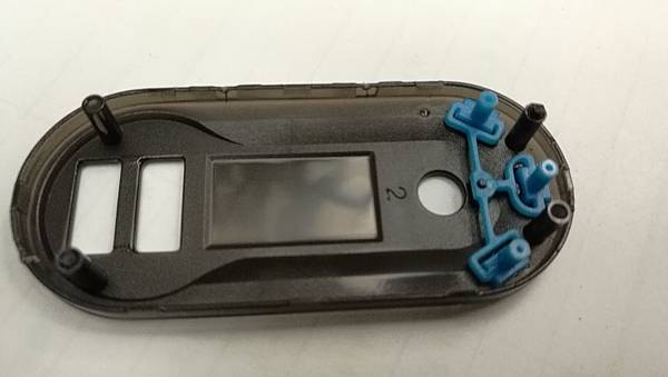 金屬框拉出來之後就可以用小起子把上蓋及下蓋分開, 分開之後就可以看到內部的電路板, 下面是分離之後的上蓋, 可以看到在周圍有四個卡榫固定: