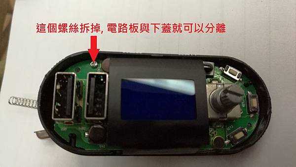 下蓋與電路板是結合在一起的, 有一個螺絲固定, 拆開螺絲之後就可以讓電路板與下蓋分離: