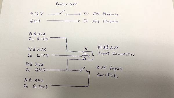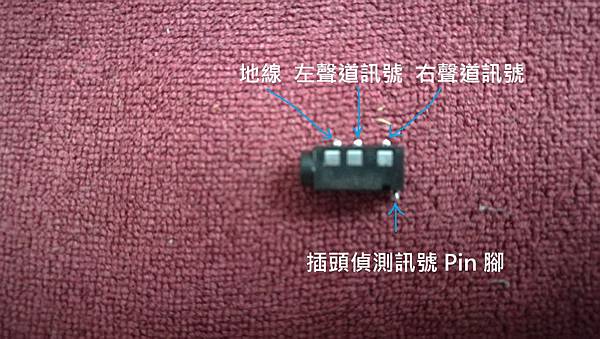 那個AUX In 的插座有四根Pin 腳, 其中左聲道, 右聲道, 地線一共三根, 另外有一跟是用來偵測是否有插頭的偵測訊號, 當沒有插頭插入時這根是空接的, 當有插頭插入的時候這根訊號是接地, 因為我們要拉到其他地方, 所以這根控制訊號要接個開關來切換, 插座訊號定義如下