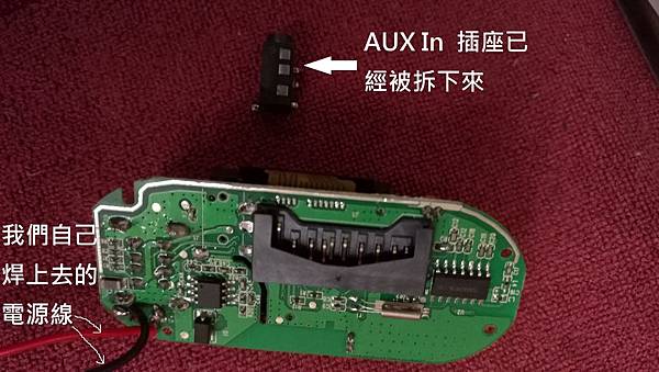 取下之後電源線也就可以拆掉, 之後換上我們自己要用的電源線, 另外因為我們要把AUX In 的插座移位所以原來在電路板上的插座也要先拆下來: