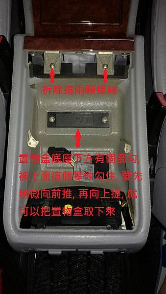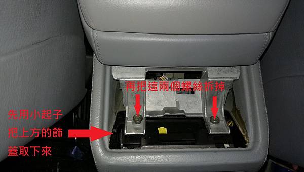 因為我們的模組要放在原本煙灰缸的地方, 下面要接電源線, 所以拆中船是必要的, 首先把中央扶手置物盒盡量向前方移動, 露出在後座出風口上方置物盒下面的飾板, 用個小起子把飾板向上方拔出來, 就可以看到兩個螺絲, 直接取下, 之後稍微向前移動再向上提, 就可以把置物盒取下來, 照片如下: