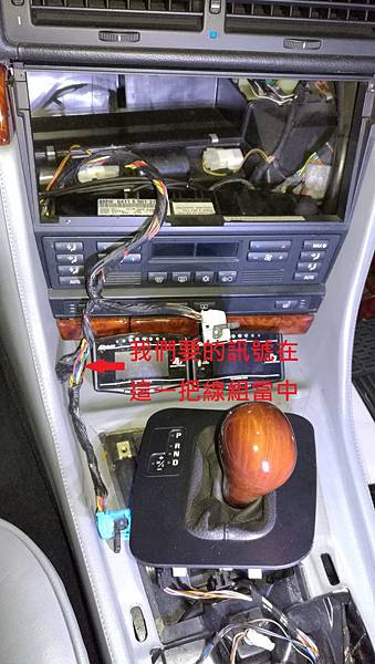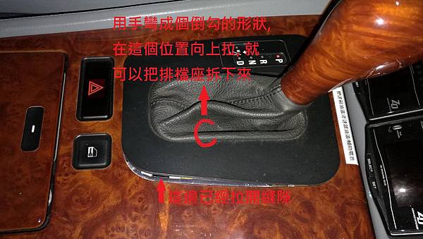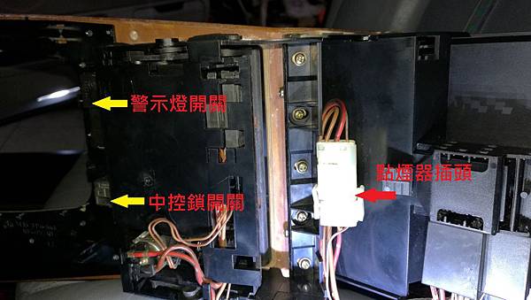 這片塑膠排檔座下面有三條插頭要先拔掉, 拆掉之後整片核木飾板稍微向車前方拉動就可以取下, 因為核木飾板上有警示開關, 中控鎖開關, 還有點煙器電源, 所以拆除的時候要先把這幾個插頭都取下來, 才能把核木飾板整個拿下來: